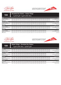 Dubai RTA Bus no: 104 runs between Ghubaiba Bus Station and Global Village.