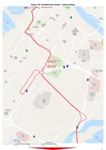 Dubai RTA Bus no: 104 runs between Ghubaiba Bus Station and Global Village.