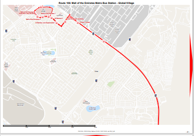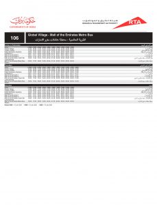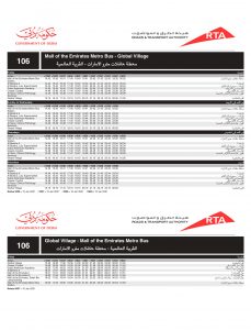 Dubai RTA Bus no: 106 runs between Mall of the Emirates (MOE) Metro station to Global Village.
