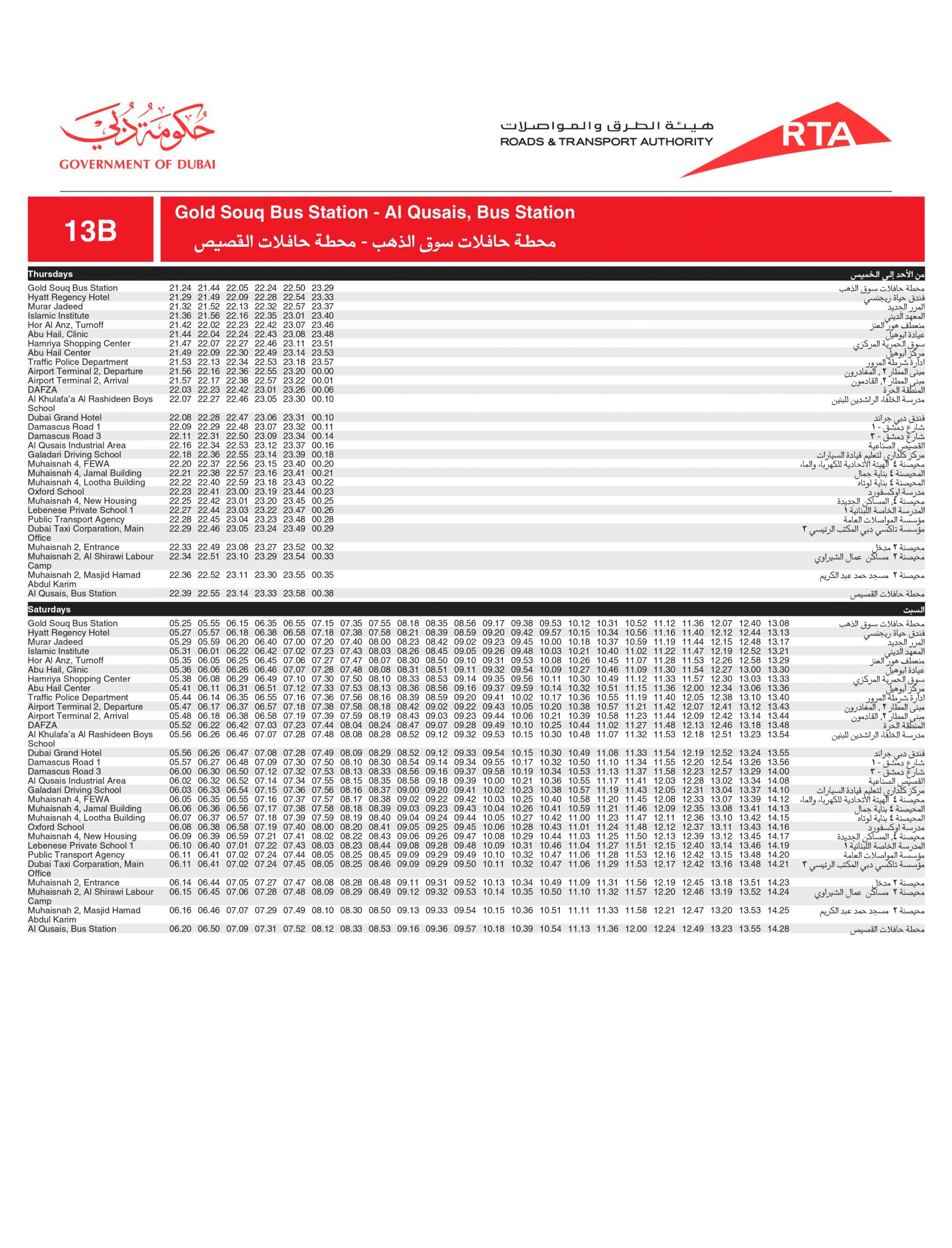 Dubai Bus number 13B stops at the below bus stops: