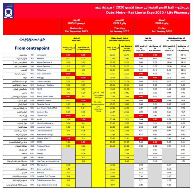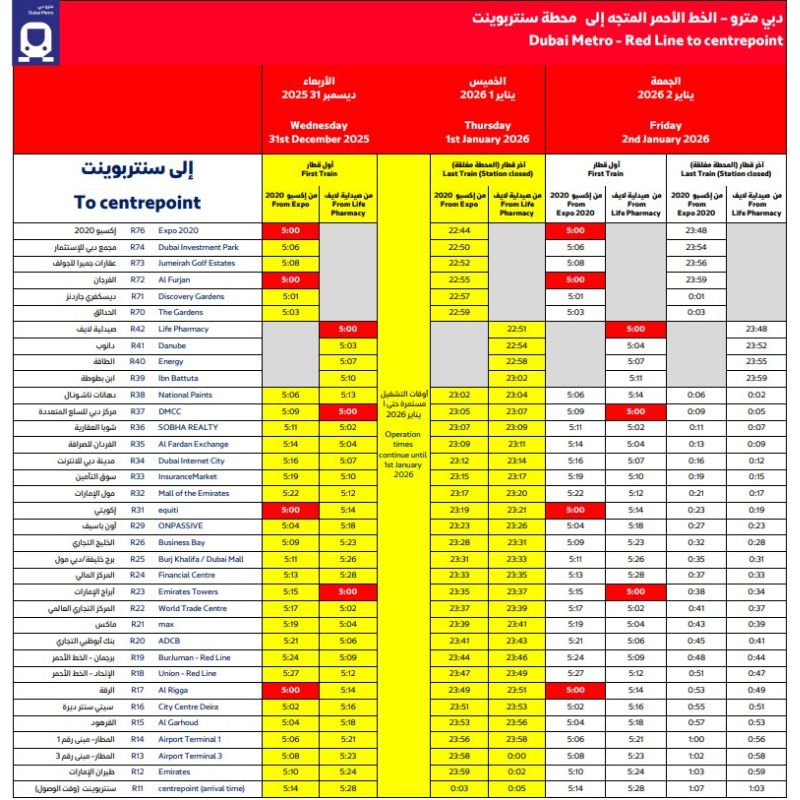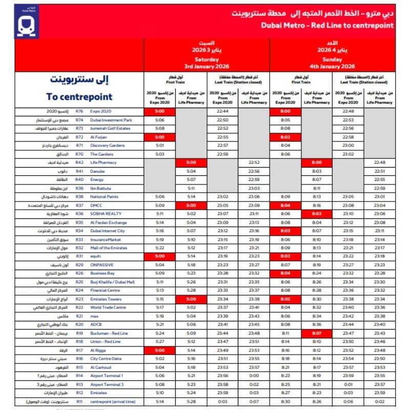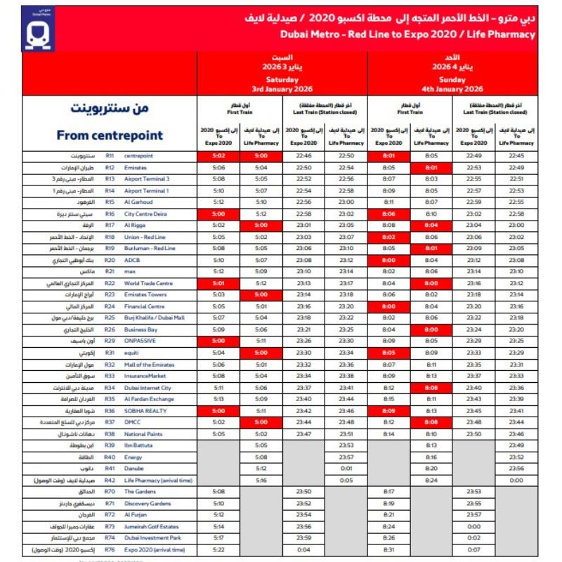 Dubai Metro Red Line (MRed) Centrepoint First Train and Last train arrival Timings 2026