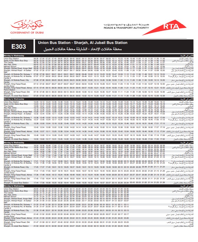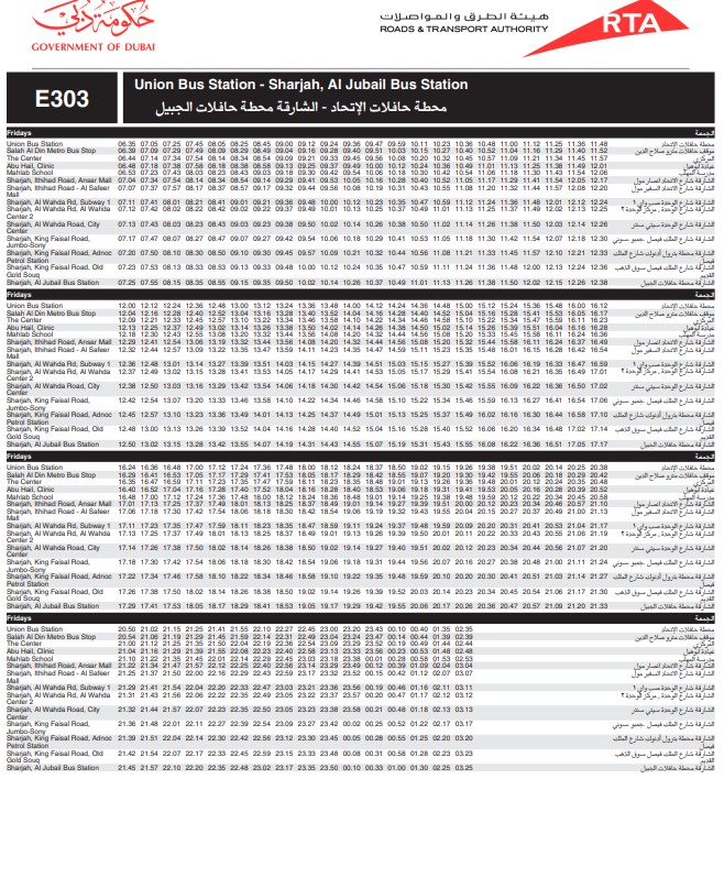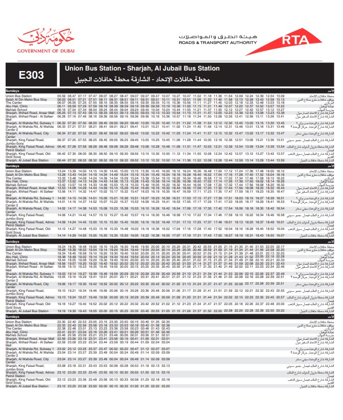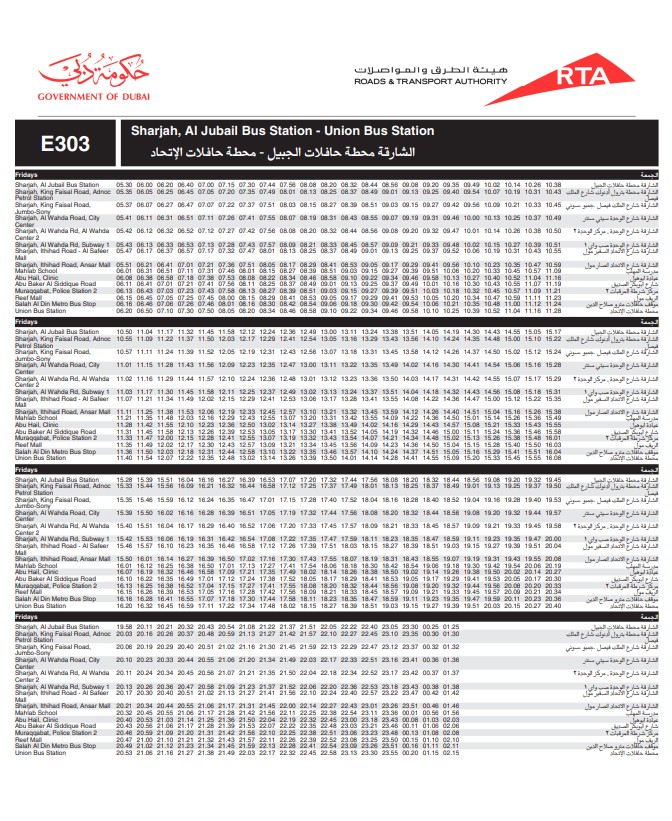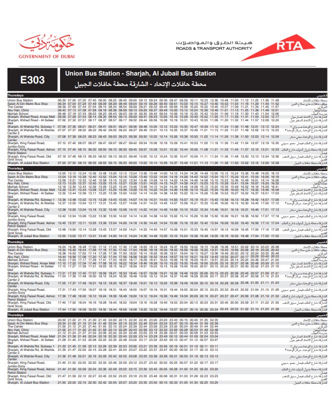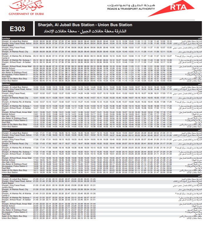 Dubai RTA Bus no: E303 runs between Union Square Bus Station and Al Jubail Bus Station.