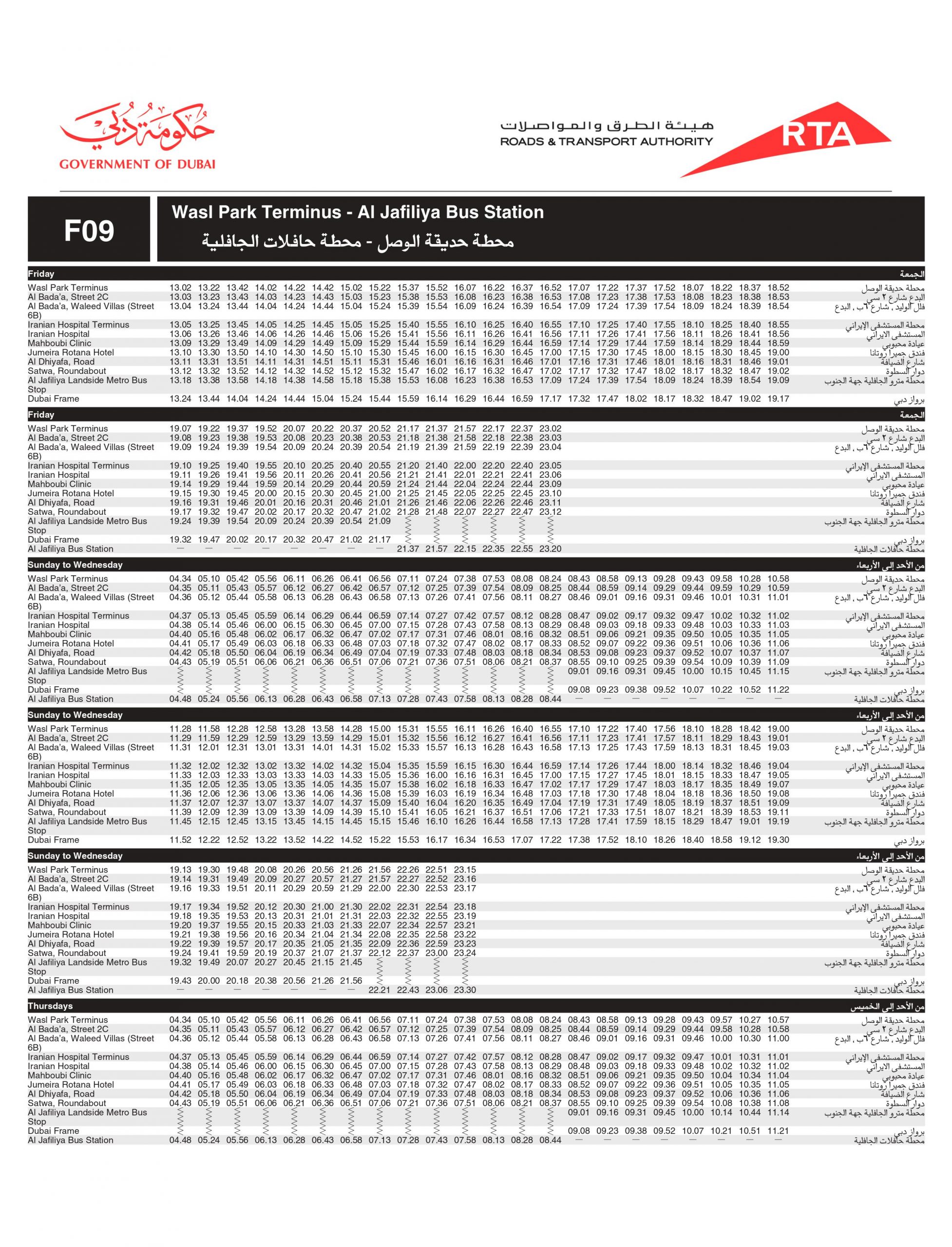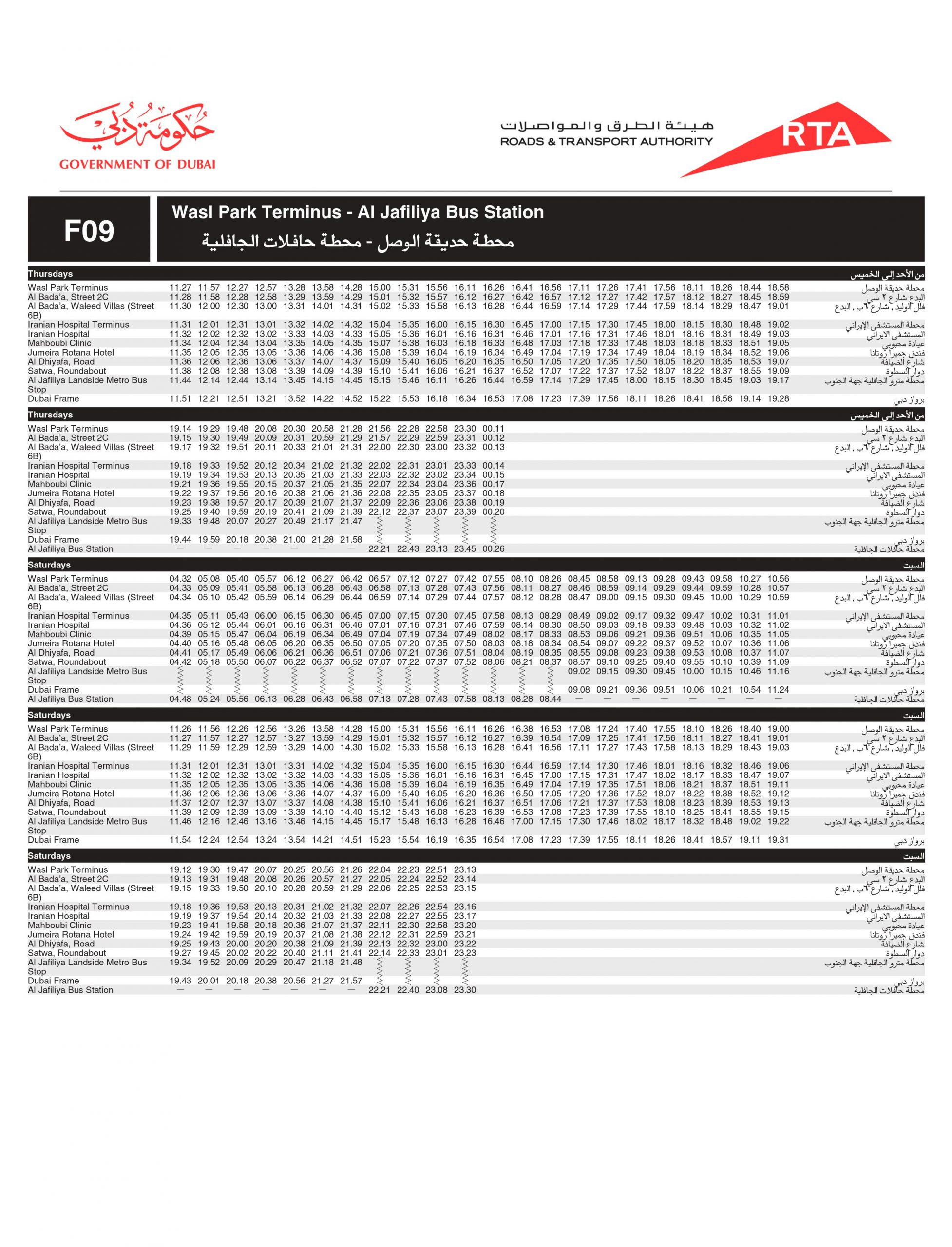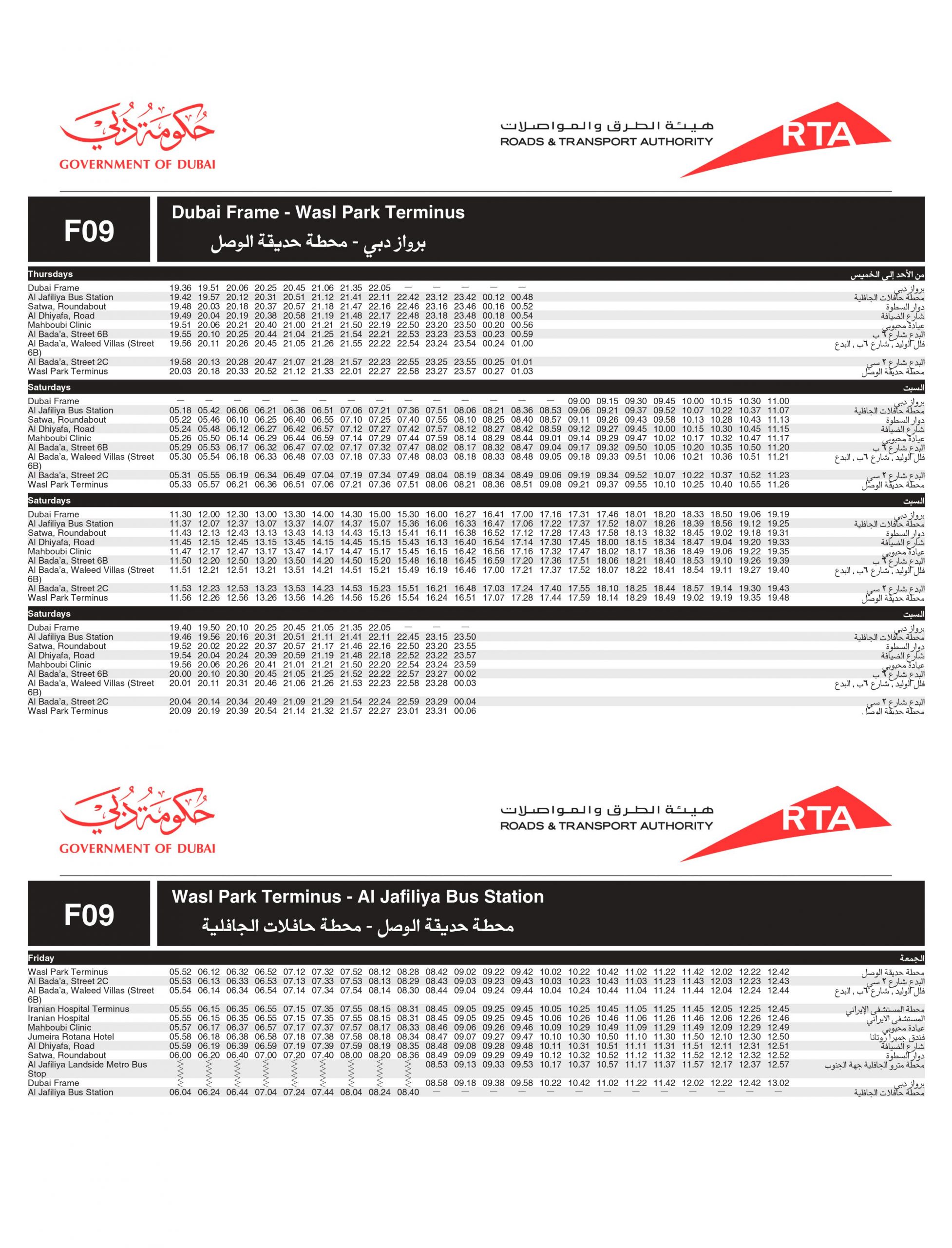 Dubai RTA Bus no: F09 runs between Al Wasl Park and Al Jafiliya Bus Station via Satwa.