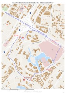 Dubai RTA Bus no: F13 runs between Dubai Mall Metro Station and Boulevard Walk Tower.