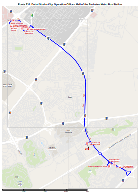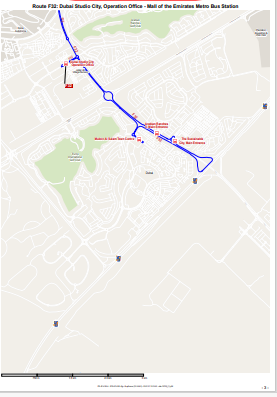 Dubai RTA Bus no: F32 runs between Mall of the Emirates Metro Station and Arabian Ranches 2 via Dubai Studio City and Sustainable City.