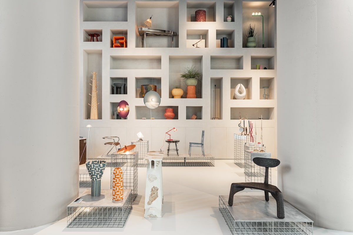 The exhibition includes curated showcases of furniture, tableware, objects, and fashion.