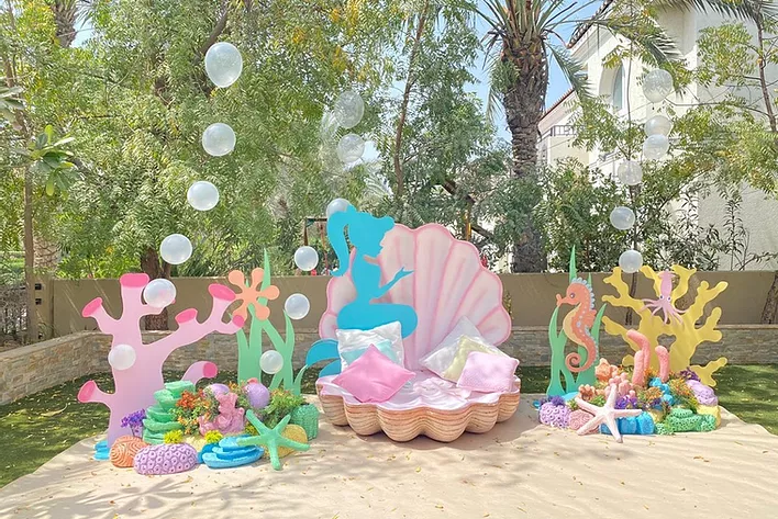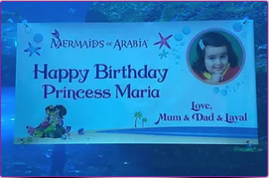 | Fantasy Birthday | Duration: 60 minutes Weekends: Thurs / Fri / Sat at 3pm, 4:30pm, and 7pm.Weekdays: Sun/Mon/Tue/Wed at 4pm, 6pm and 7:30pm Note: This package must be booked in advance. | AED 550 One parent or guardian admitted for free. Additional guests admission fee: AED 100 per person | Mermaid makeover and simple hairstyling Costume dress-up and photo shoot 1 printed photo with frame to decorate Digital copies of all photos Mermaid encounter Plain ‘Happy Birthday’ banner |
