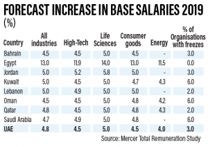Overall salaries projected to increase by 4.8% in the UAE across all industries in 2019, with the strongest surge likely to come for those employed in non-energy industries. Other sectors that are expected to see strong increase include consumer goods and high-tech industries with real wage growth. They are also expected to steadily rise in the region. In the previous years, the market saw a significant restructuring in organisations, particularly in the banking sector which affected employment rates and adversely influenced salary levels.