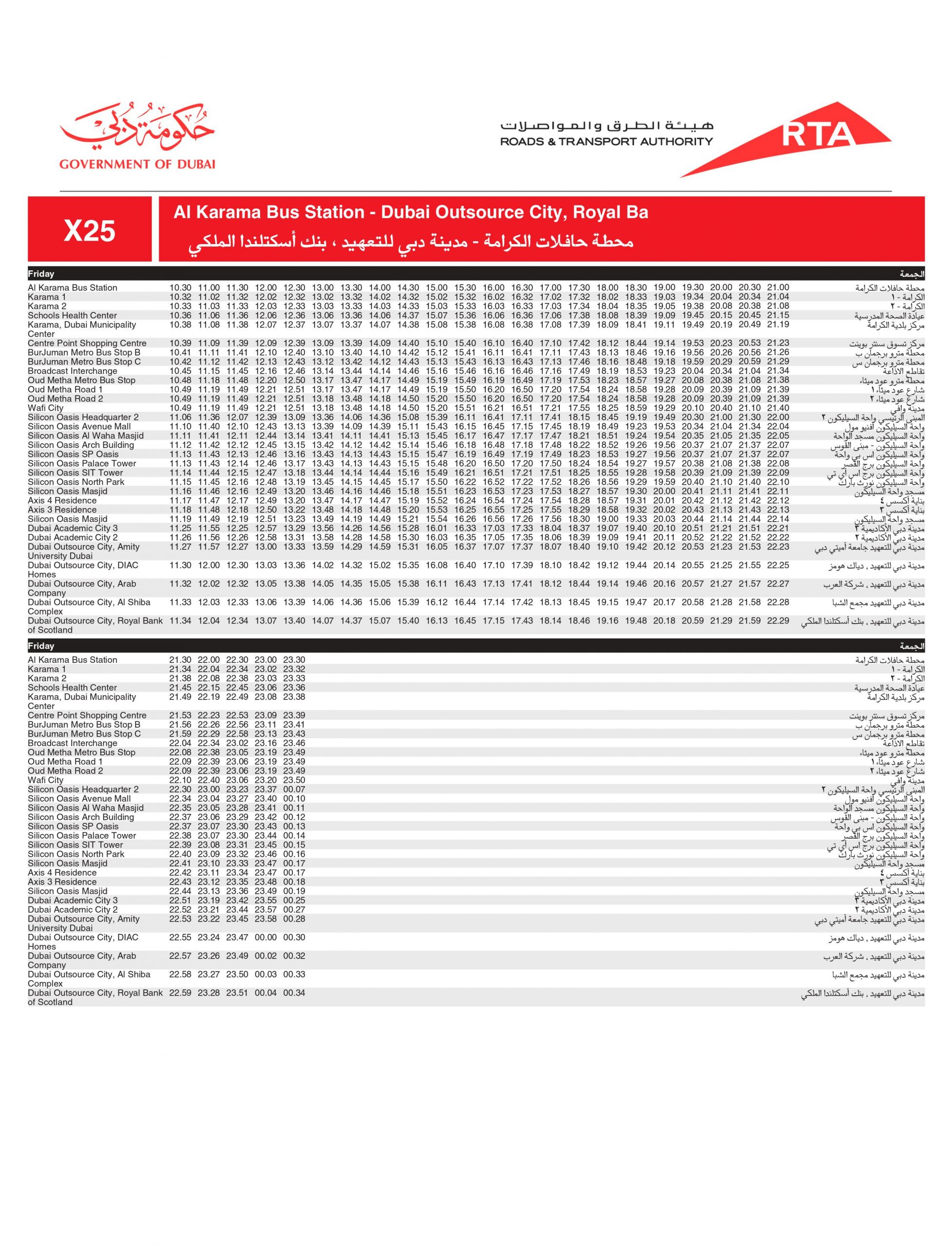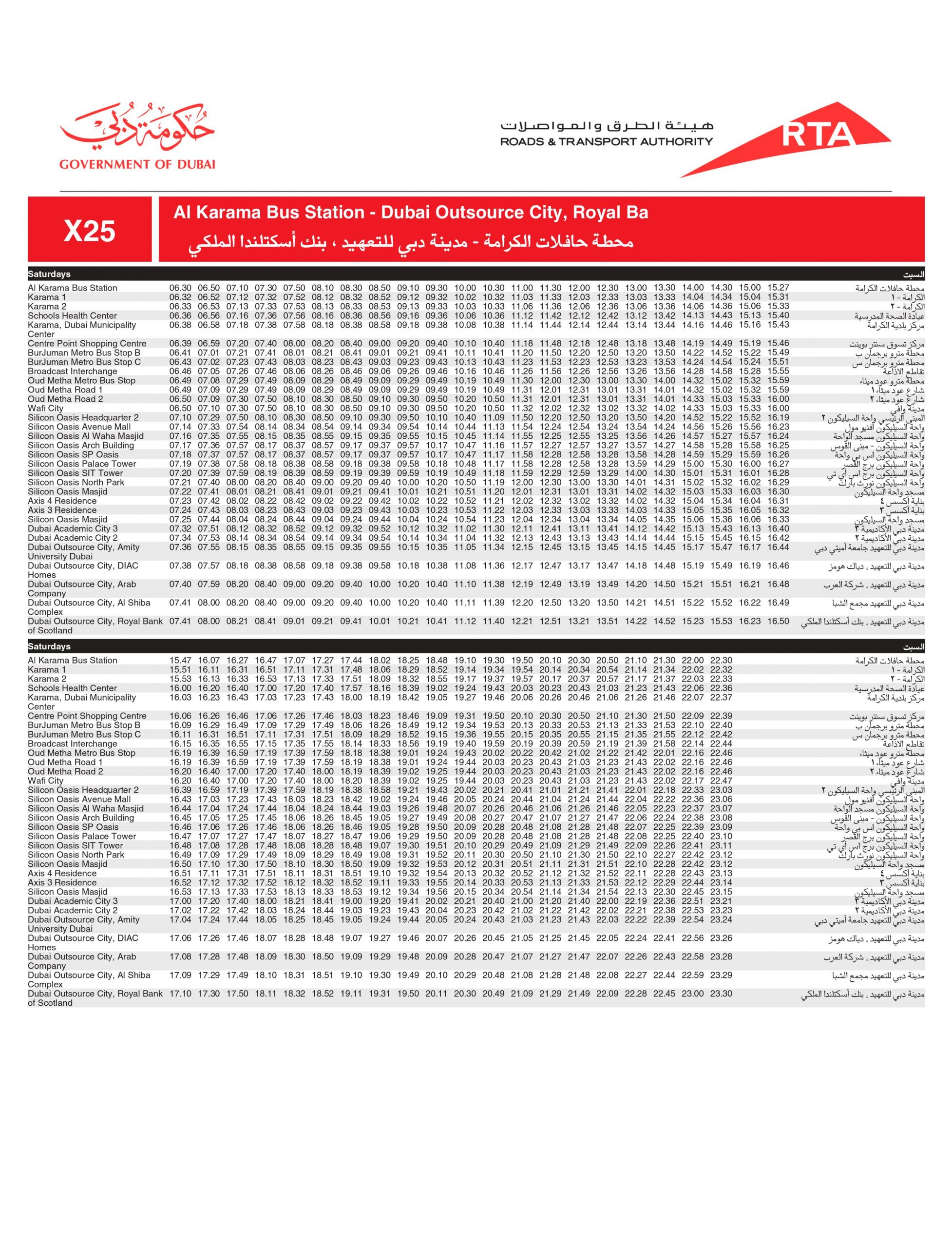 Dubai RTA Bus no: X25 runs between Al Karama Bus Station and Dubai Outsourcing Zone