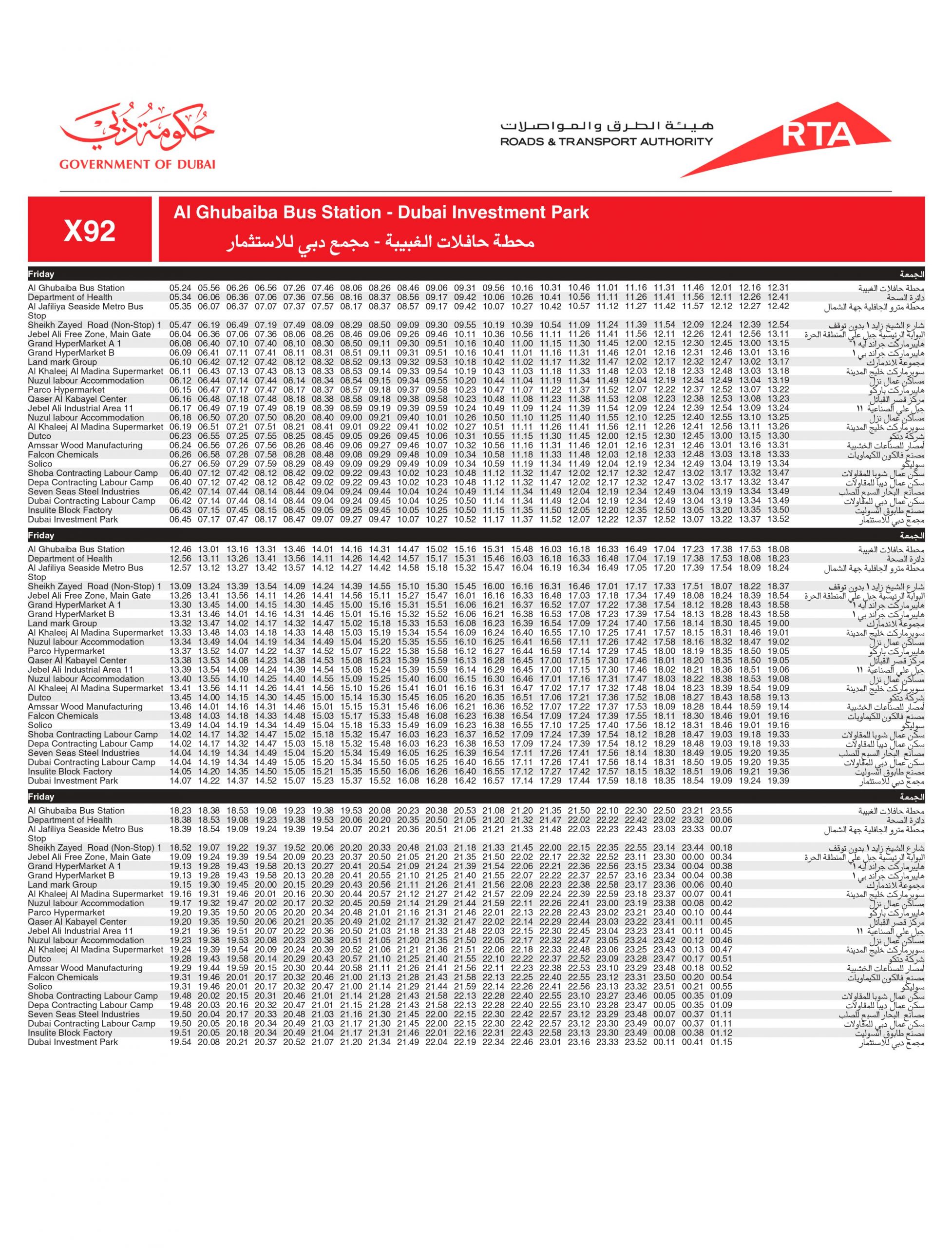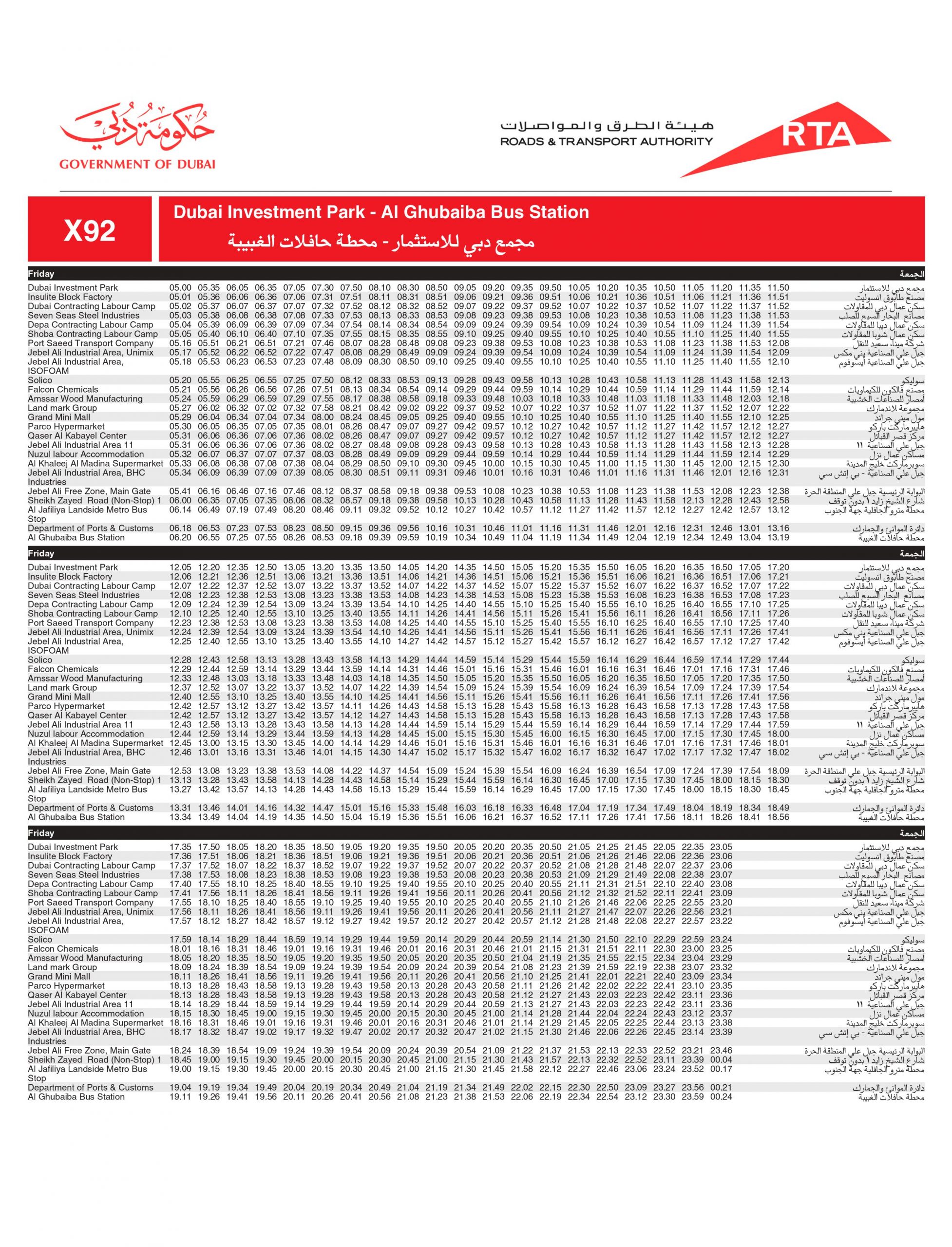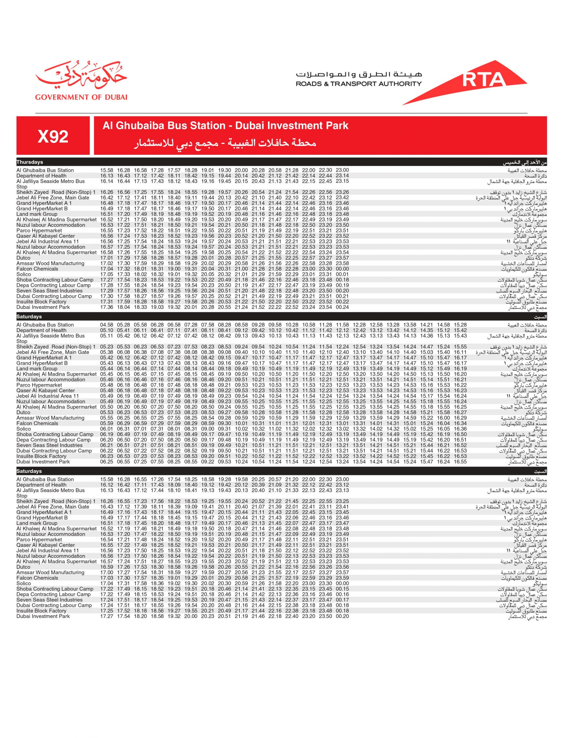 Dubai Bus number X92 stops at the below bus stops: