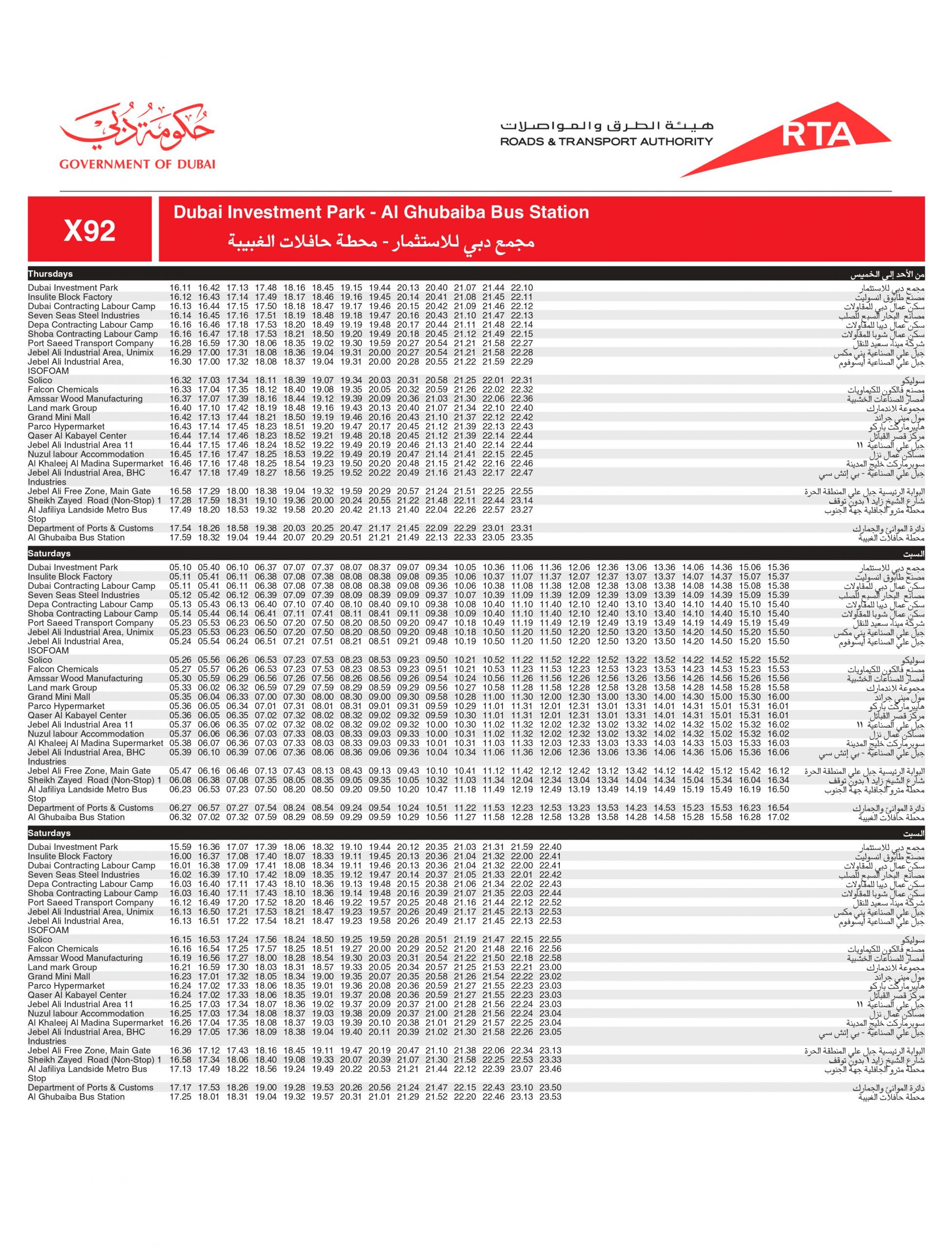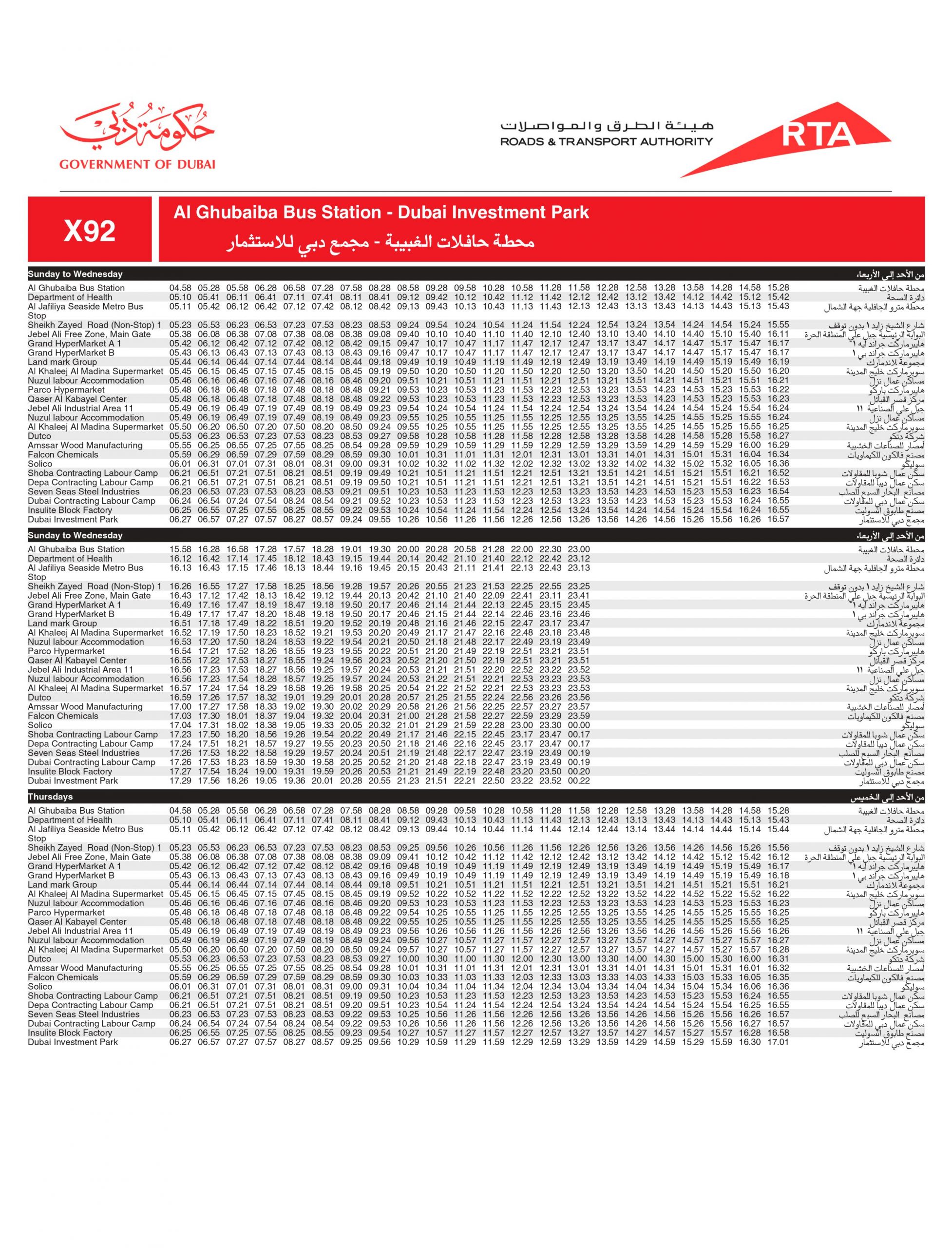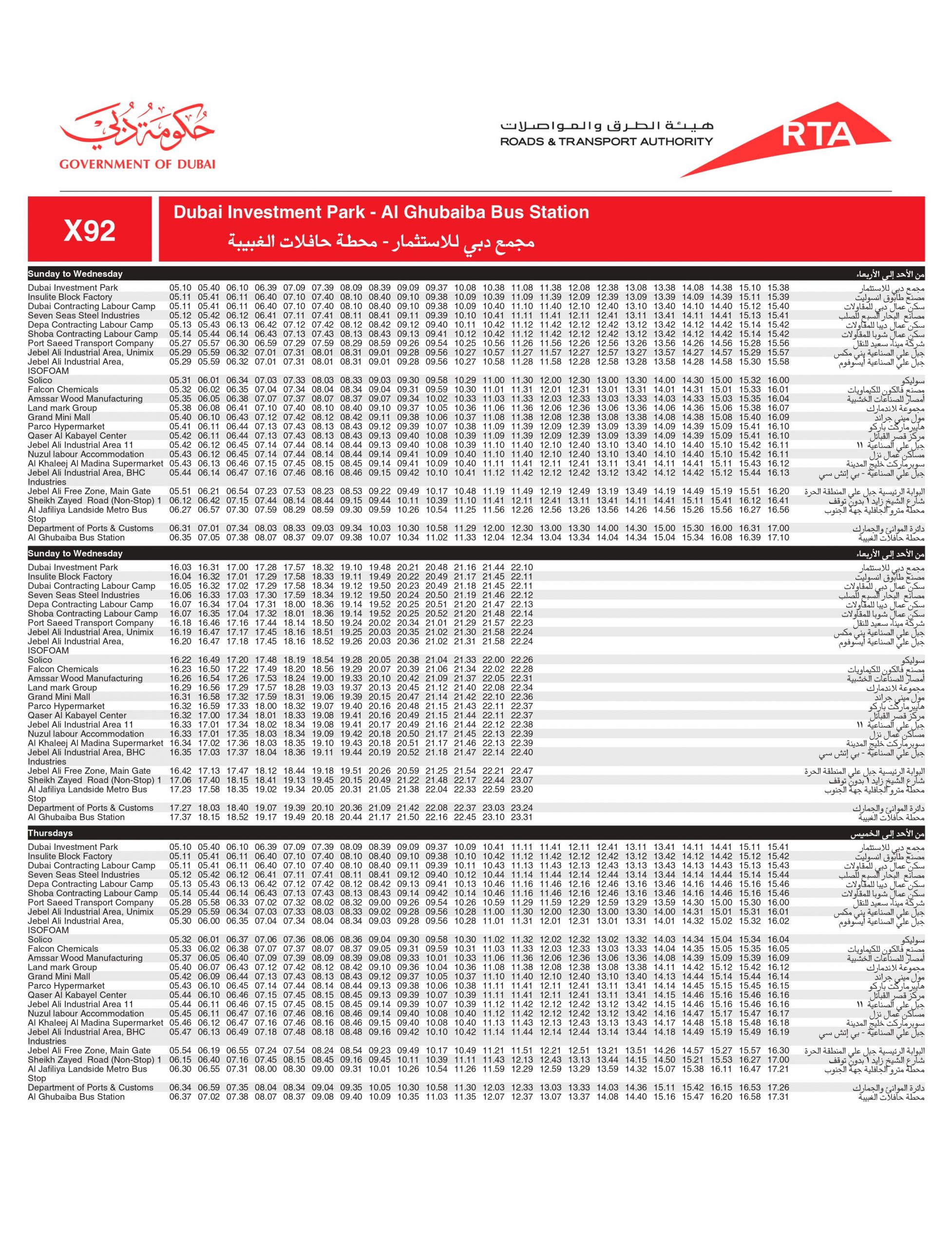 Dubai RTA Bus no: X92 runs between Al Ghubaiba Bus Station and Dubai Investment Park.
