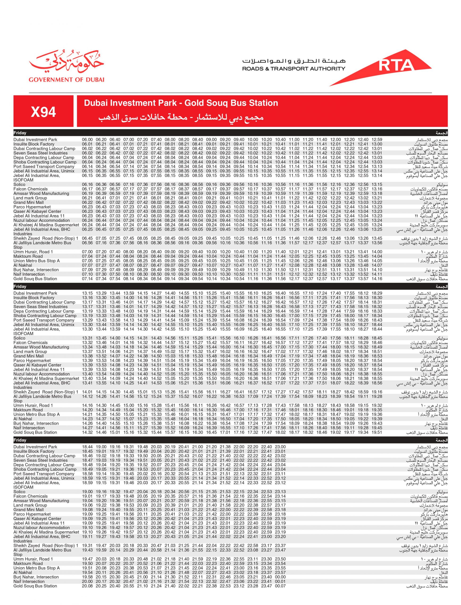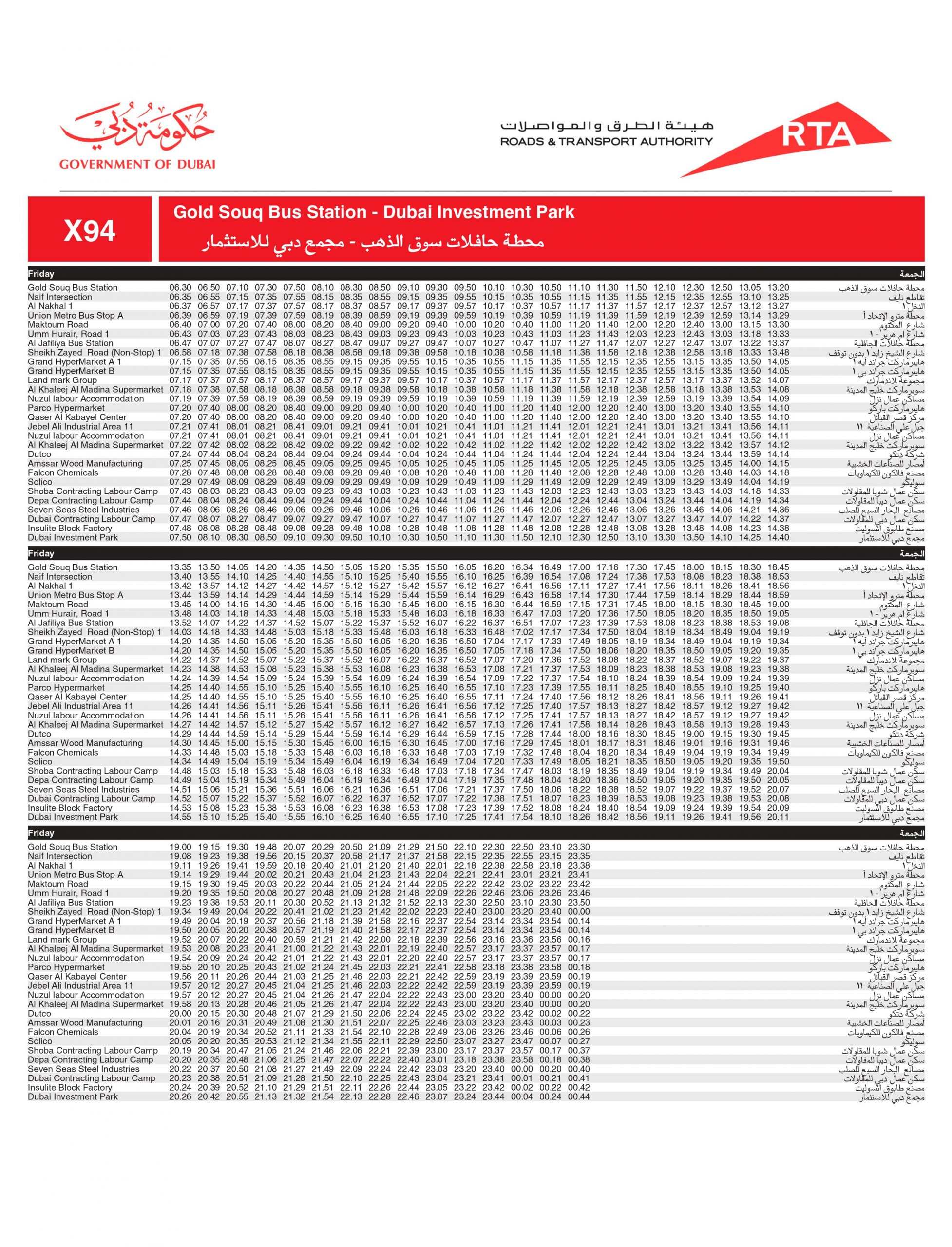 - The X94 bus route has 17 stations from Gold Souq to Dubai Investment Park and 16 stations in the reverse direction.